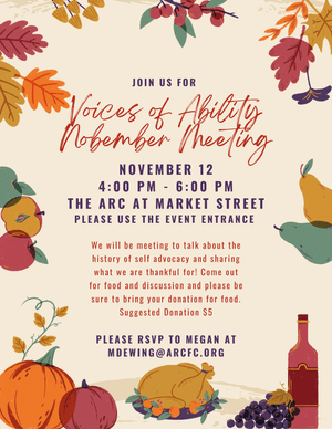 This Voices of Ability meeting, we will be meeting to talk about the history of self advocacy and sharing what we are thankful for. Suggestion donation of $5 for pizza and drinks. Please RSVP to Megan Dewing.